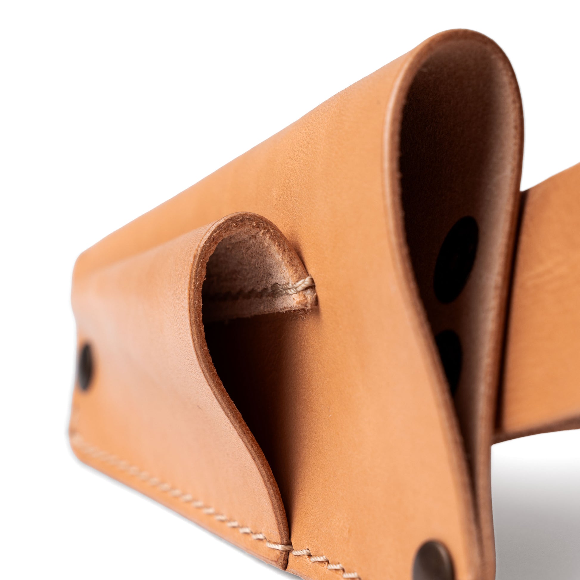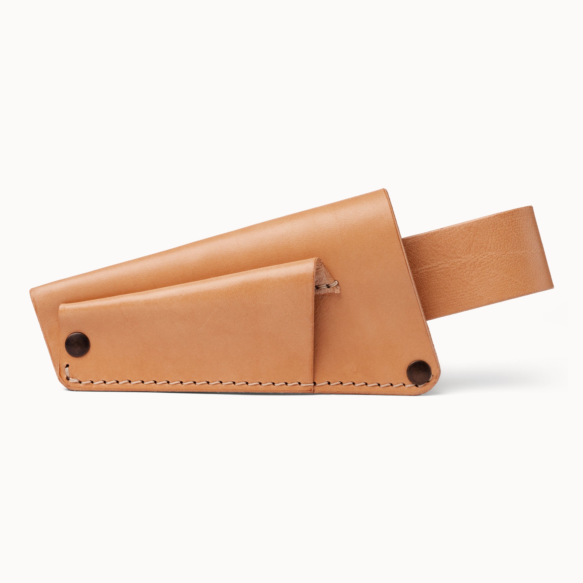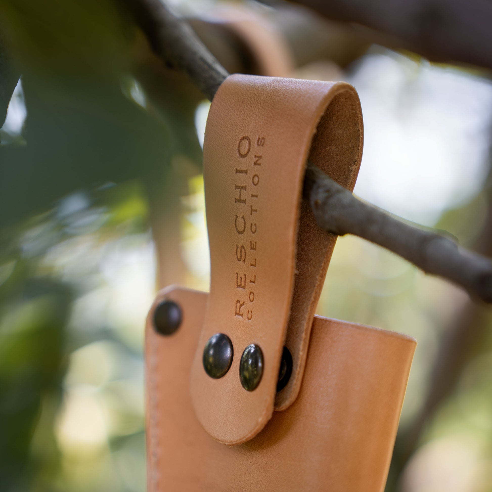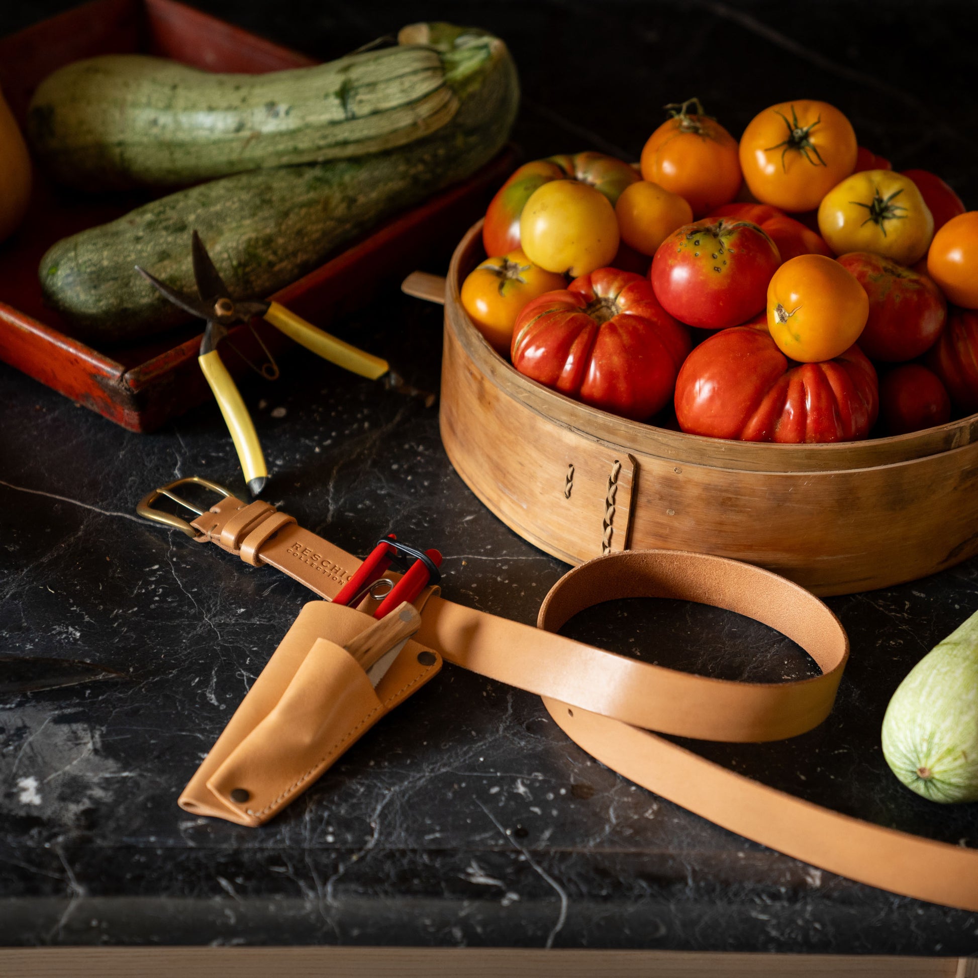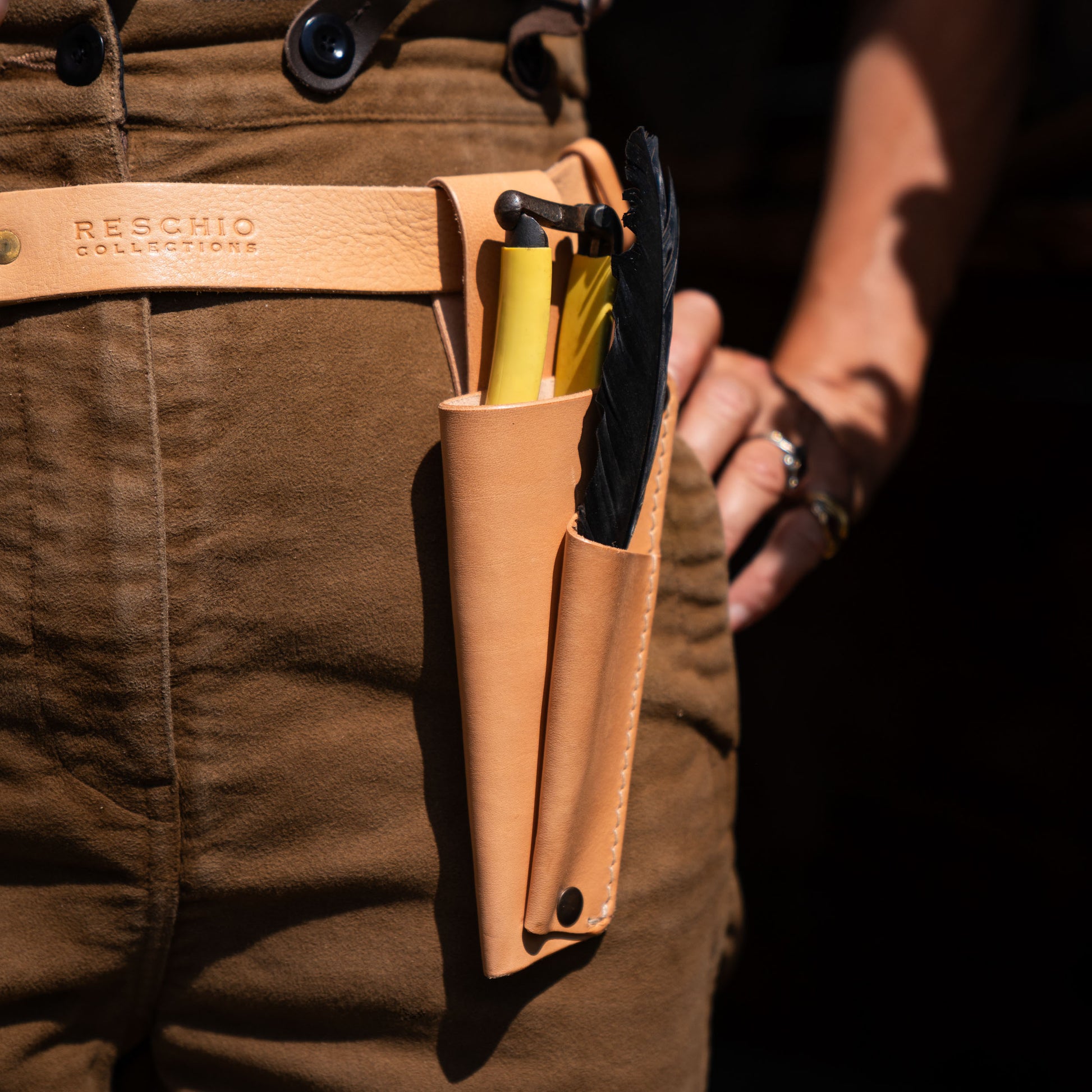 Pensato per chi lavora con cura e mestiere, questo porta cesoie è tagliato e cucito a mano in cuoio toscano conciato al vegetale. Due scomparti mantengono in ordine gli attrezzi, mentre il passante con bottone a scatto in ottone invecchiato permette di fissarlo saldamente alla cintura. Funzionale, resistente, sincero: il cuoio si scurirà e acquisterà carattere con il tempo, dimostrando il suo valore anno dopo anno.