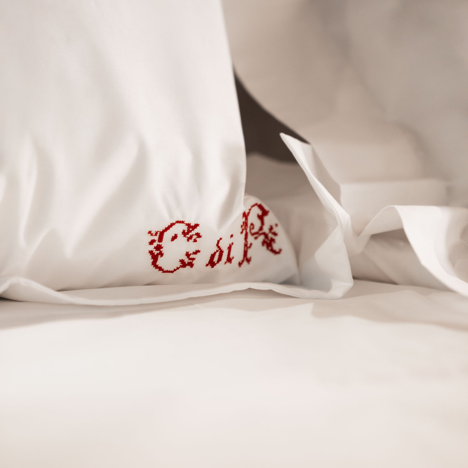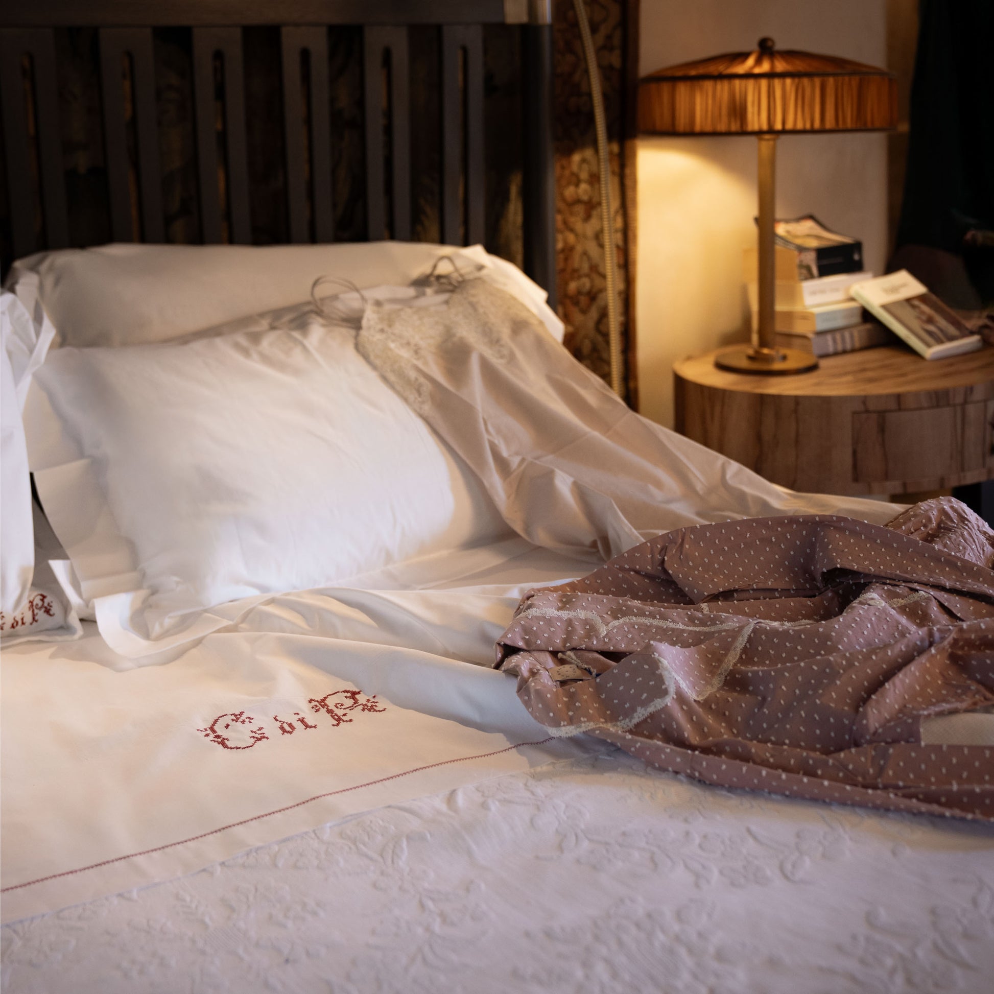 Realizzato in percalle 100% cotone pettinato e mercerizzato, questo set da 300 fili regala una sensazione di freschezza e purezza assoluta. Il candore del tessuto è valorizzato da dettagli sartoriali: orli jour a contrasto, ricami a punto croce, finiture precise. Disponibile in diverse tonalità per il ricamo, veste il letto con leggerezza e carattere. Prodotta in Italia.