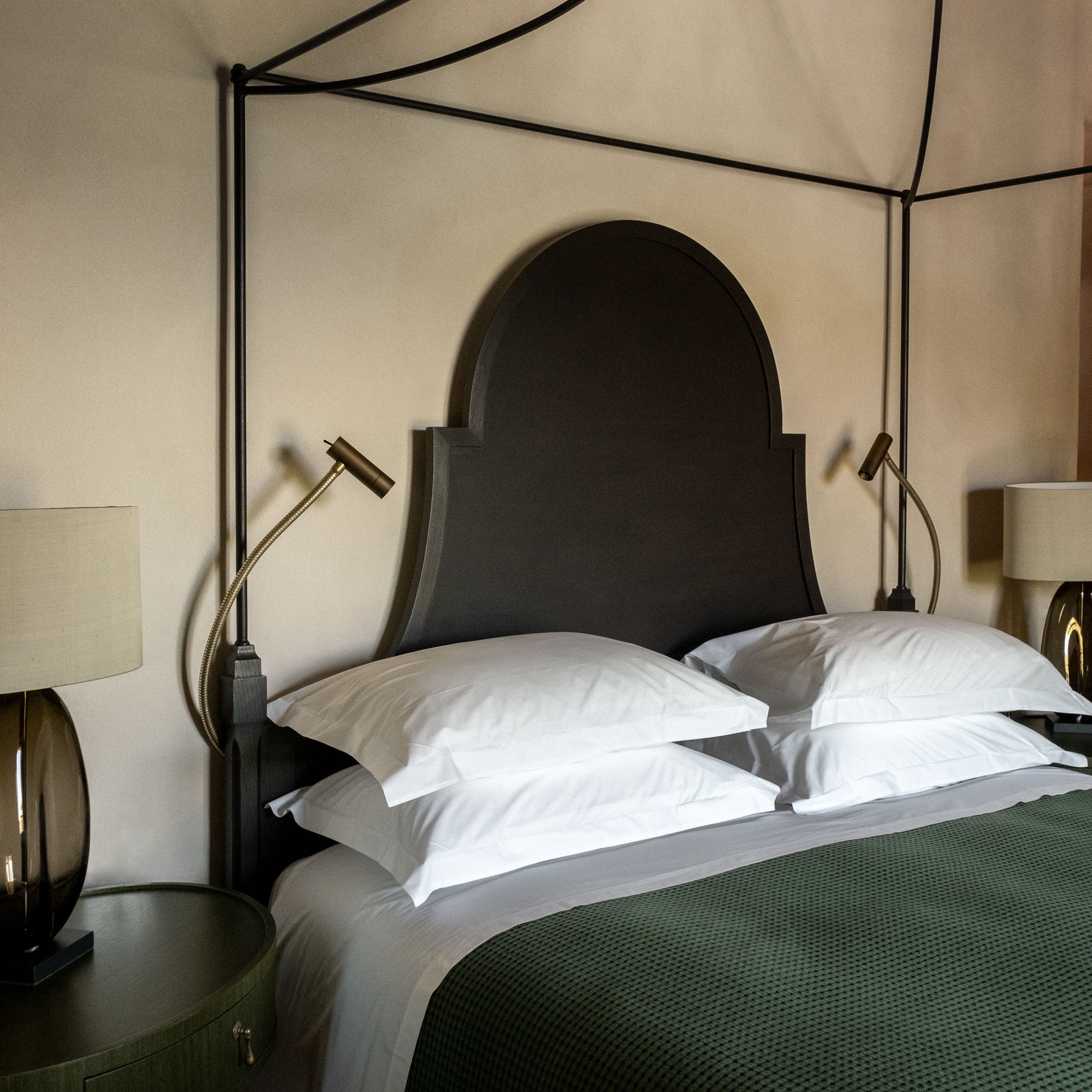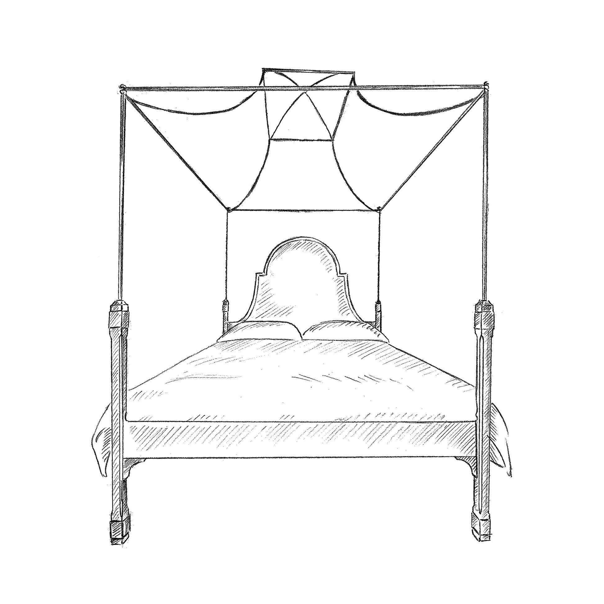 «Pur provenendo dalla stessa scuderia del Bone Bed, la sua testata barocca pronunciata e il complesso baldacchino in ferro conferiscono a questo letto una meravigliosa e discreta grandiosità.» Architetto Conte Benedikt Bolza
