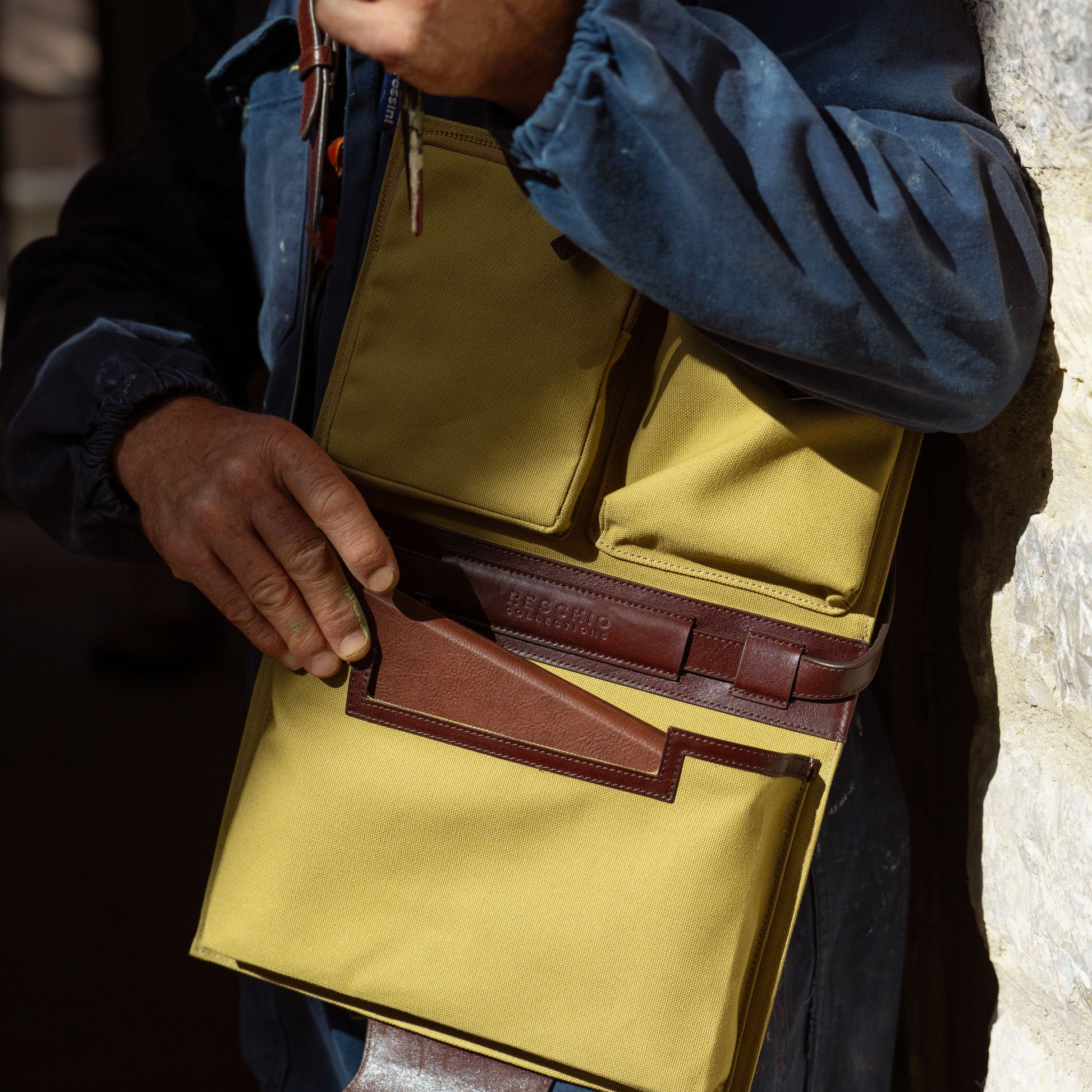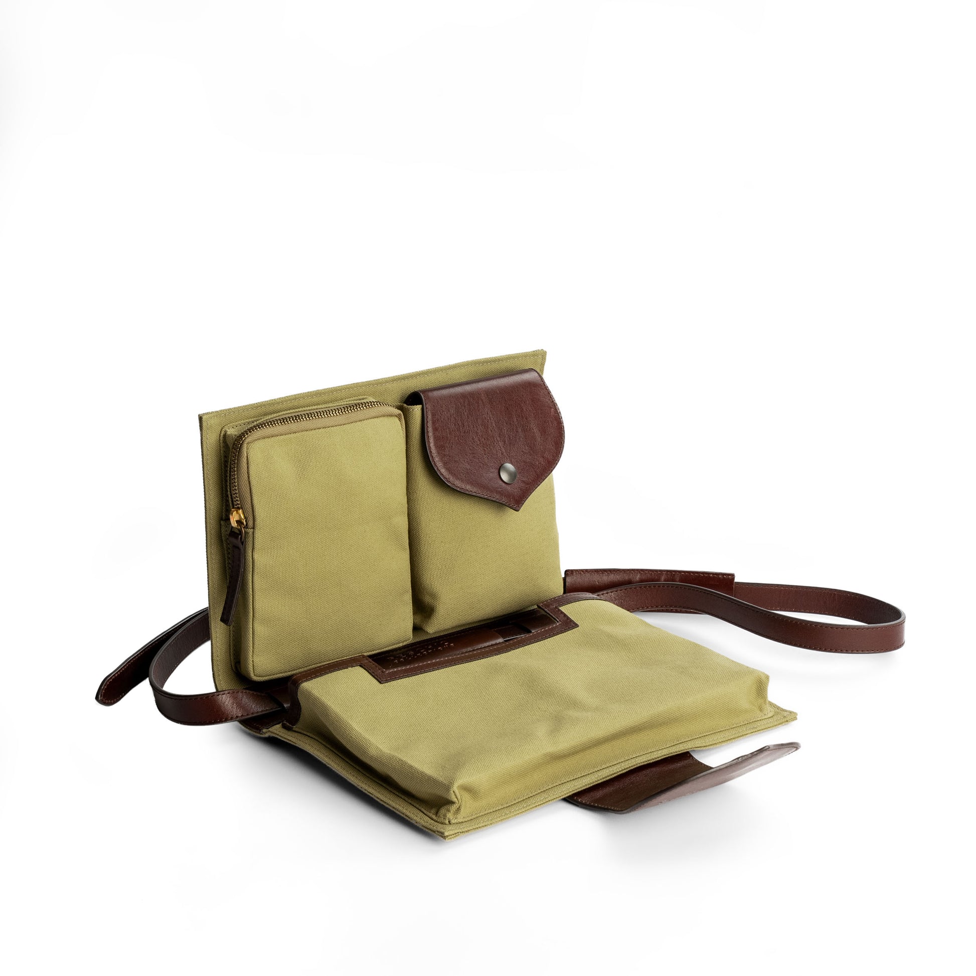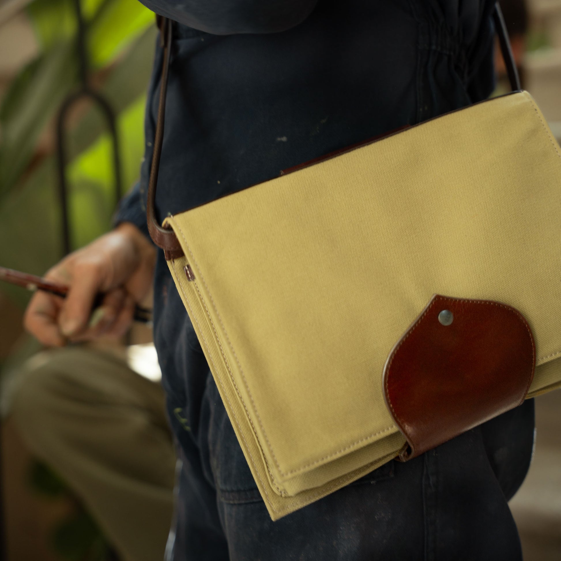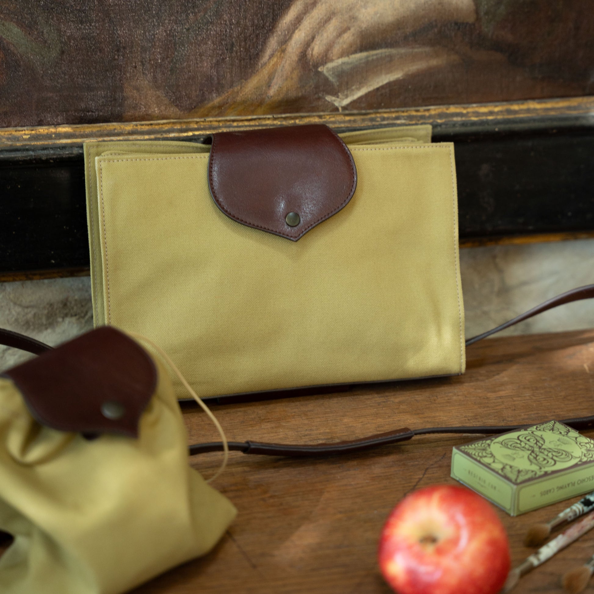 Recycled and organic cotton, Tuscan leather and brass come together in this finely crafted bag, designed with the art of watercolouring in mind. Leather loops along the spine can hold brushes, pencils and other tools, while a generous interior pocket may keep a sketchbook safely in place. Additional compartments offer space for paints and other essentials. Of course, it need not be confined to artistic pursuits — perfectly sized for a book, wallet and phone, it is a companion as practical as it is beautiful.