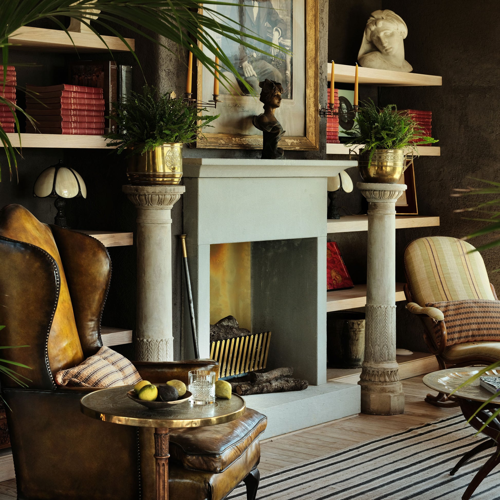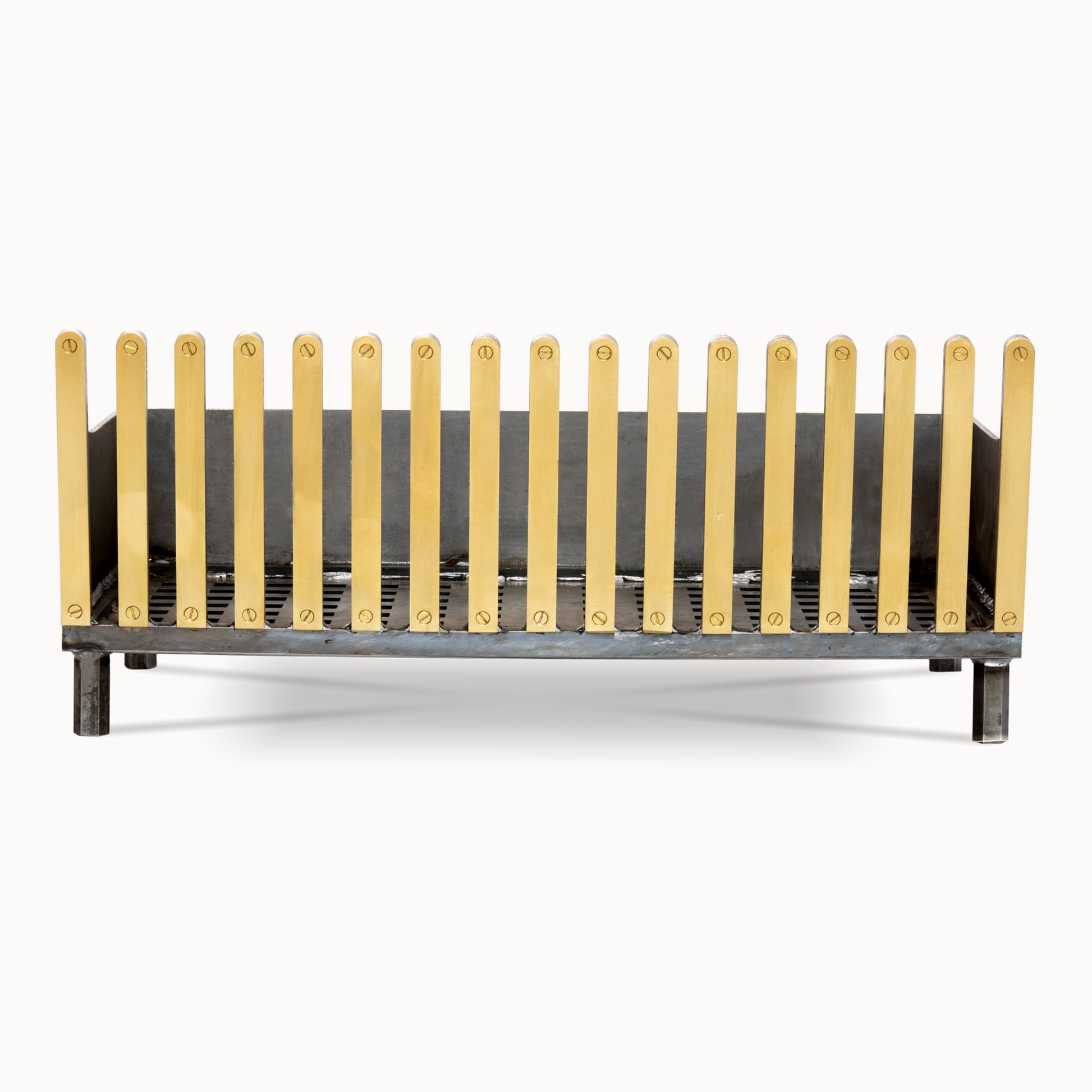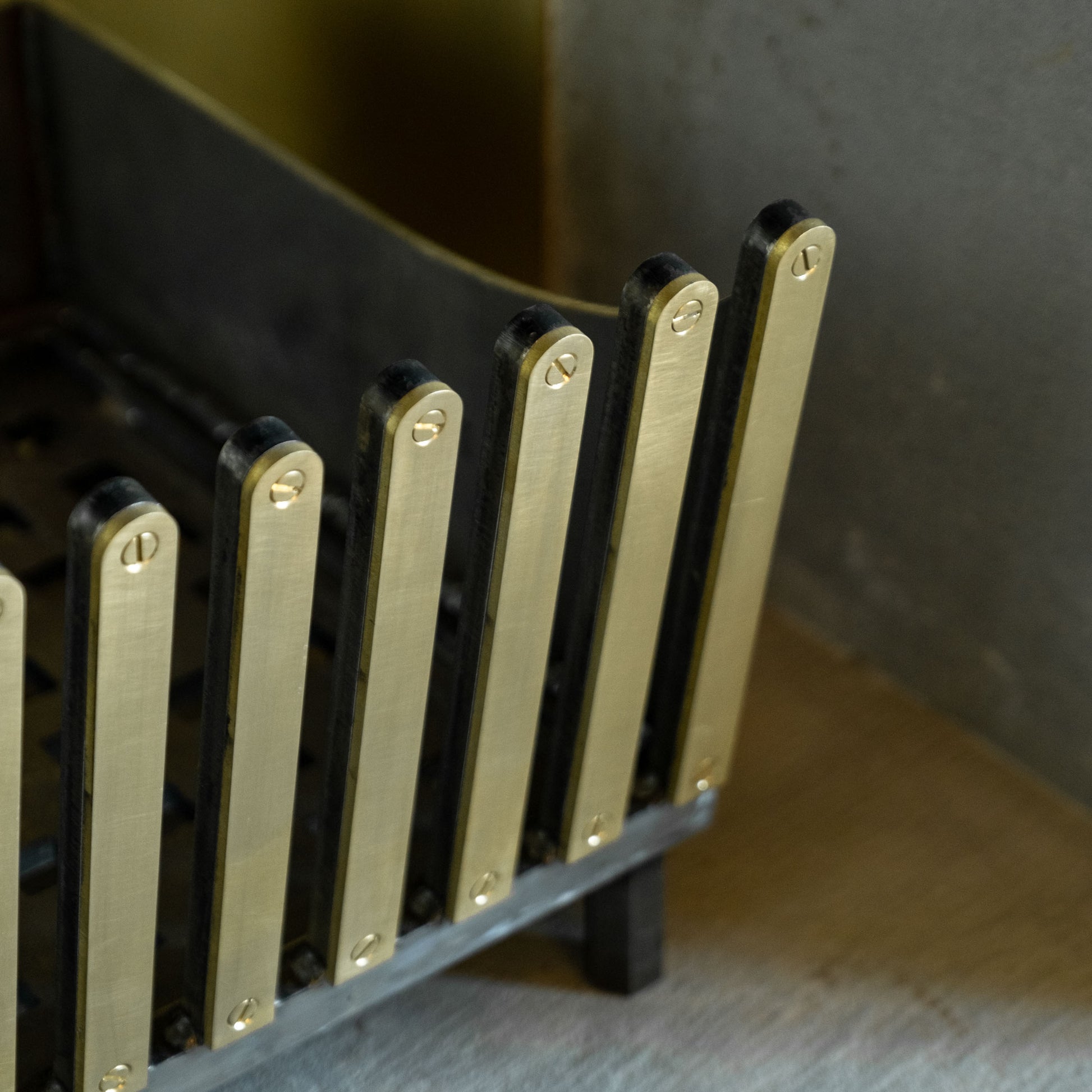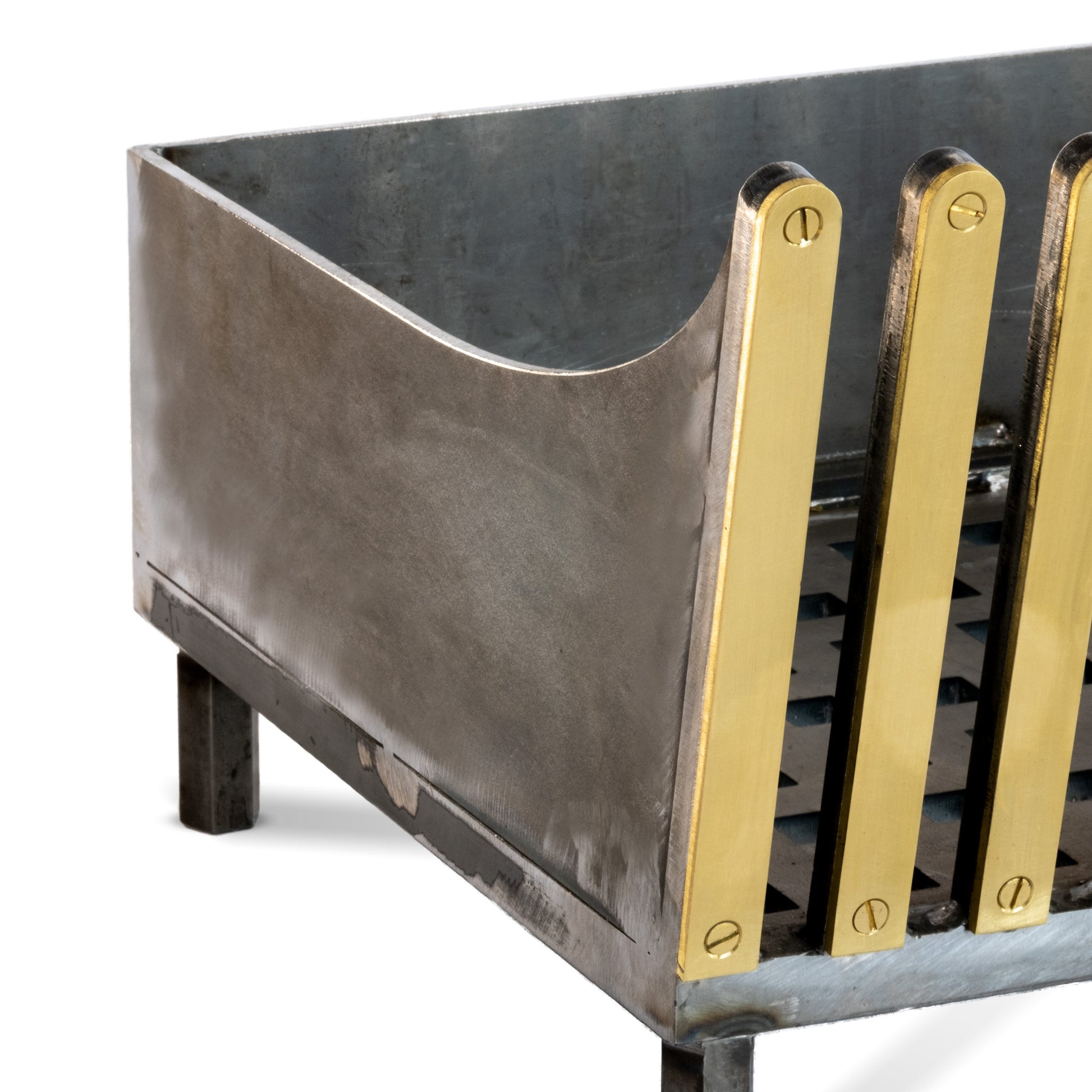 A rectangular grate originally made for a converted barn at Reschio, now a space for creativity. The solid steel frame is detailed with brass accents on the front, while the back is enclosed with a steel plate to rest neatly against the hearth wall.