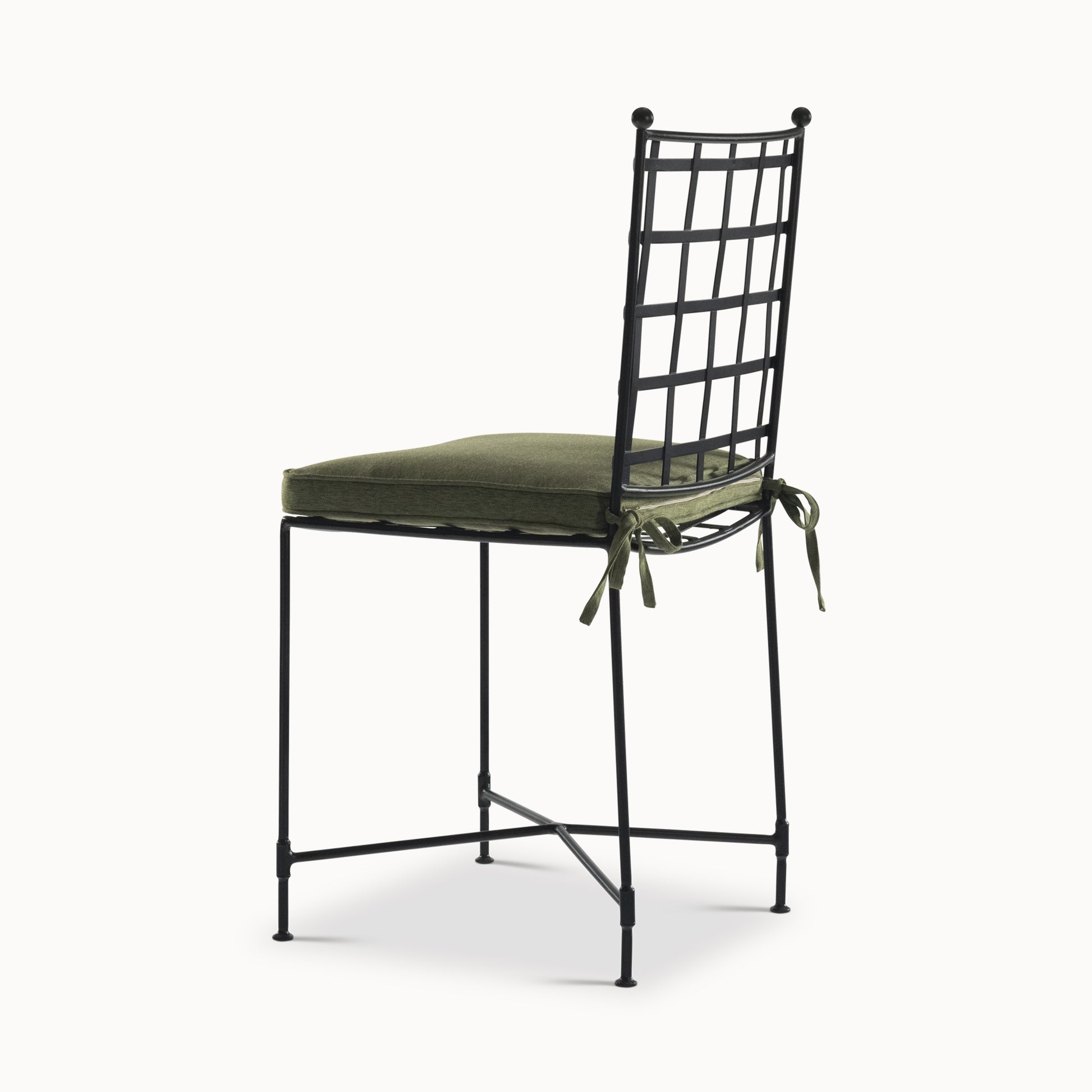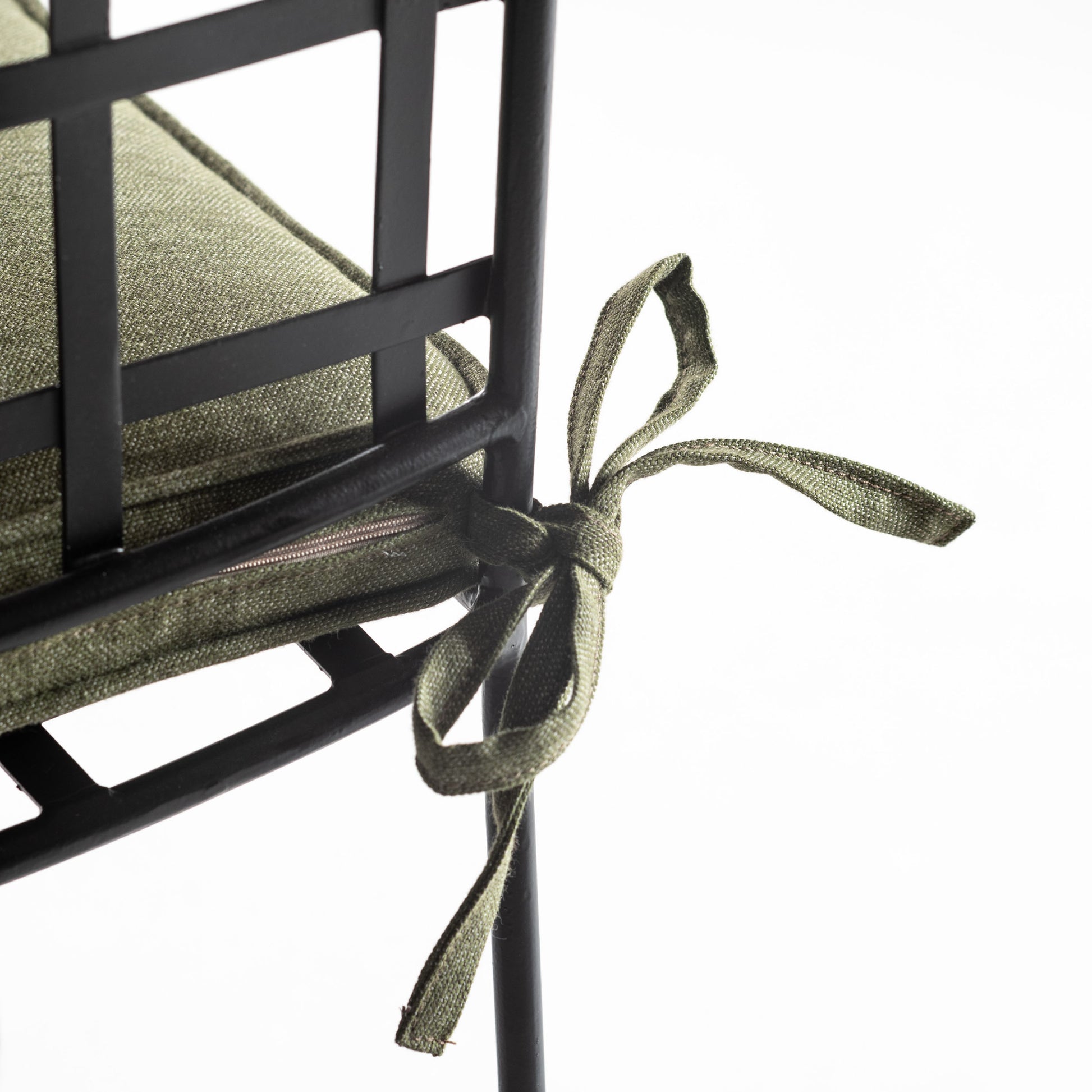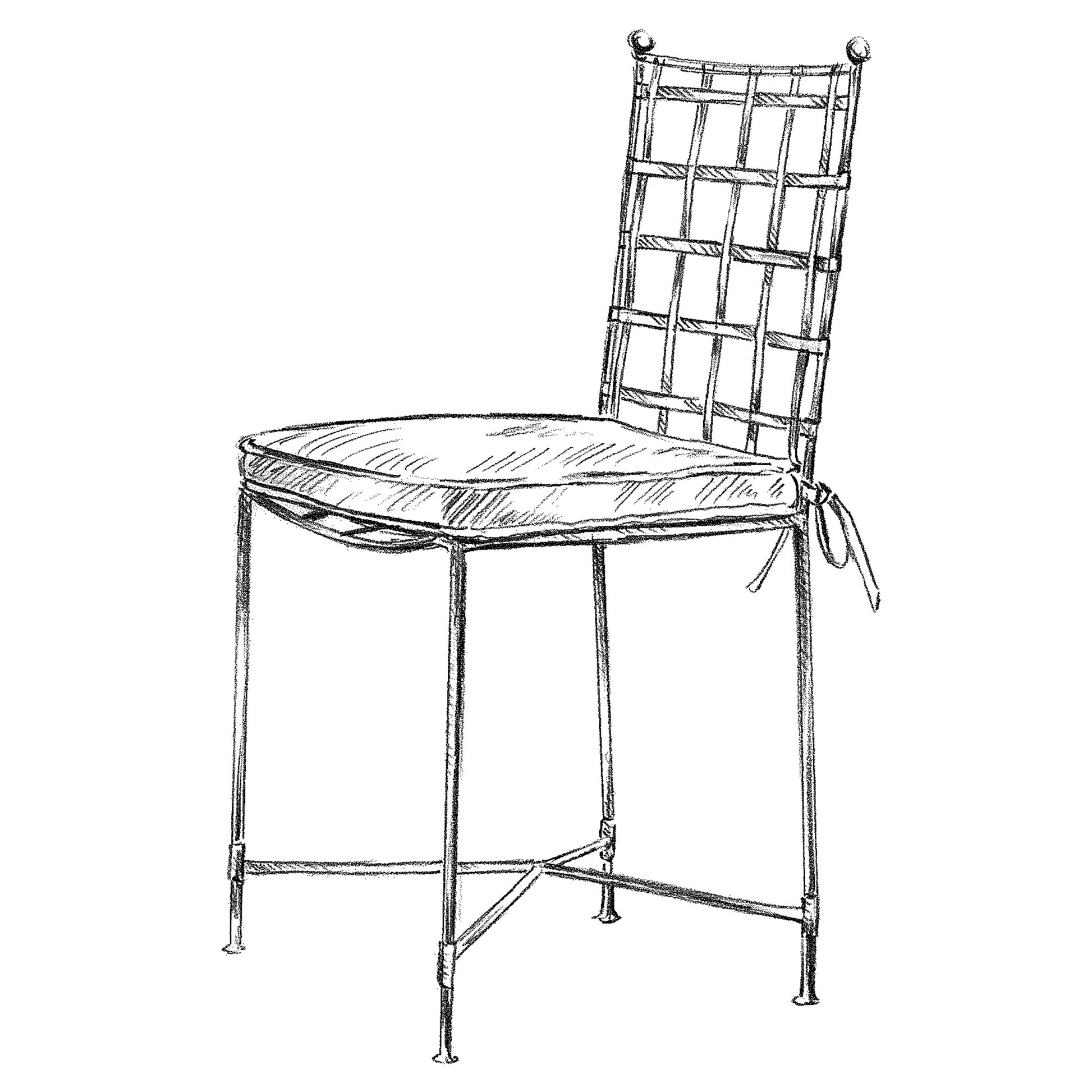 This refined chair, inspired by 18th-century garden furniture, blends simplicity and function. Its frame is made from zinc-coated, powder-coated steel, while the cushions are designed specifically for outdoor use—ideal around an al fresco dining table. Usually tone-on-tone, the piping can also be customised in a contrasting colour for an extra touch of elegance.