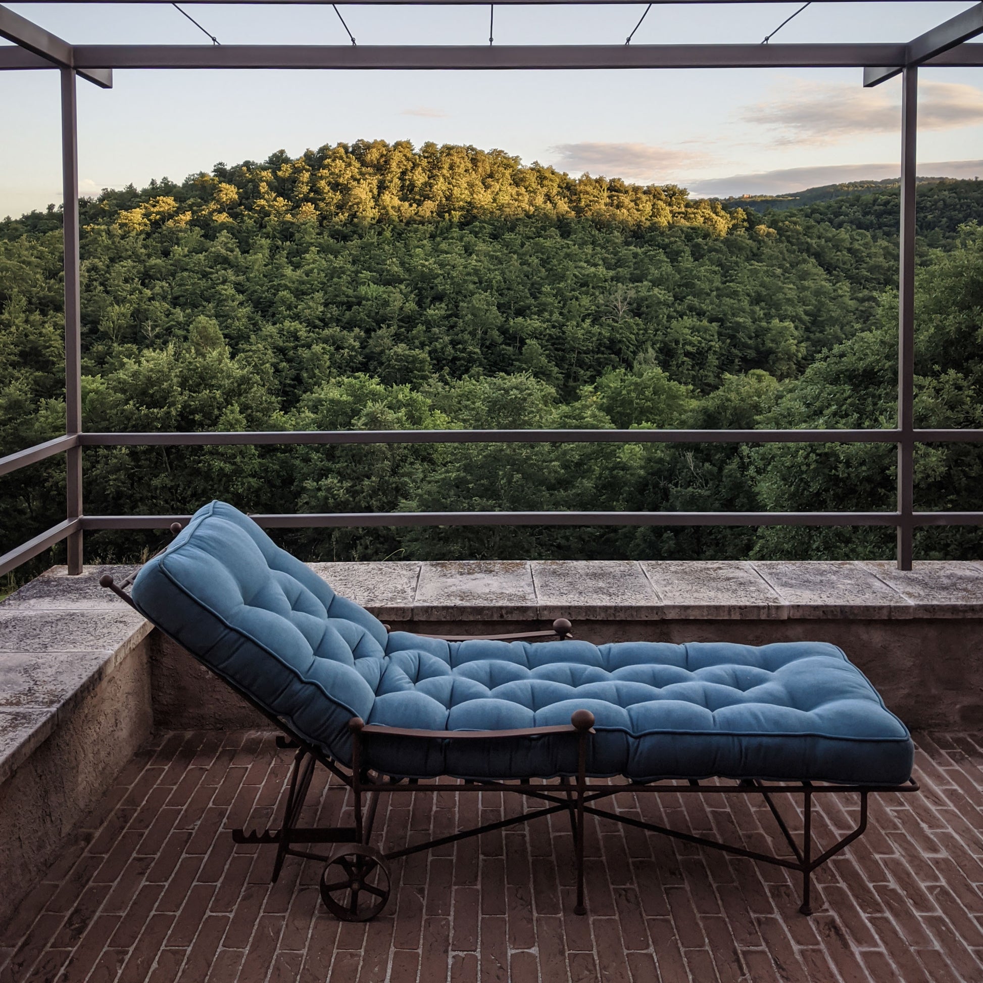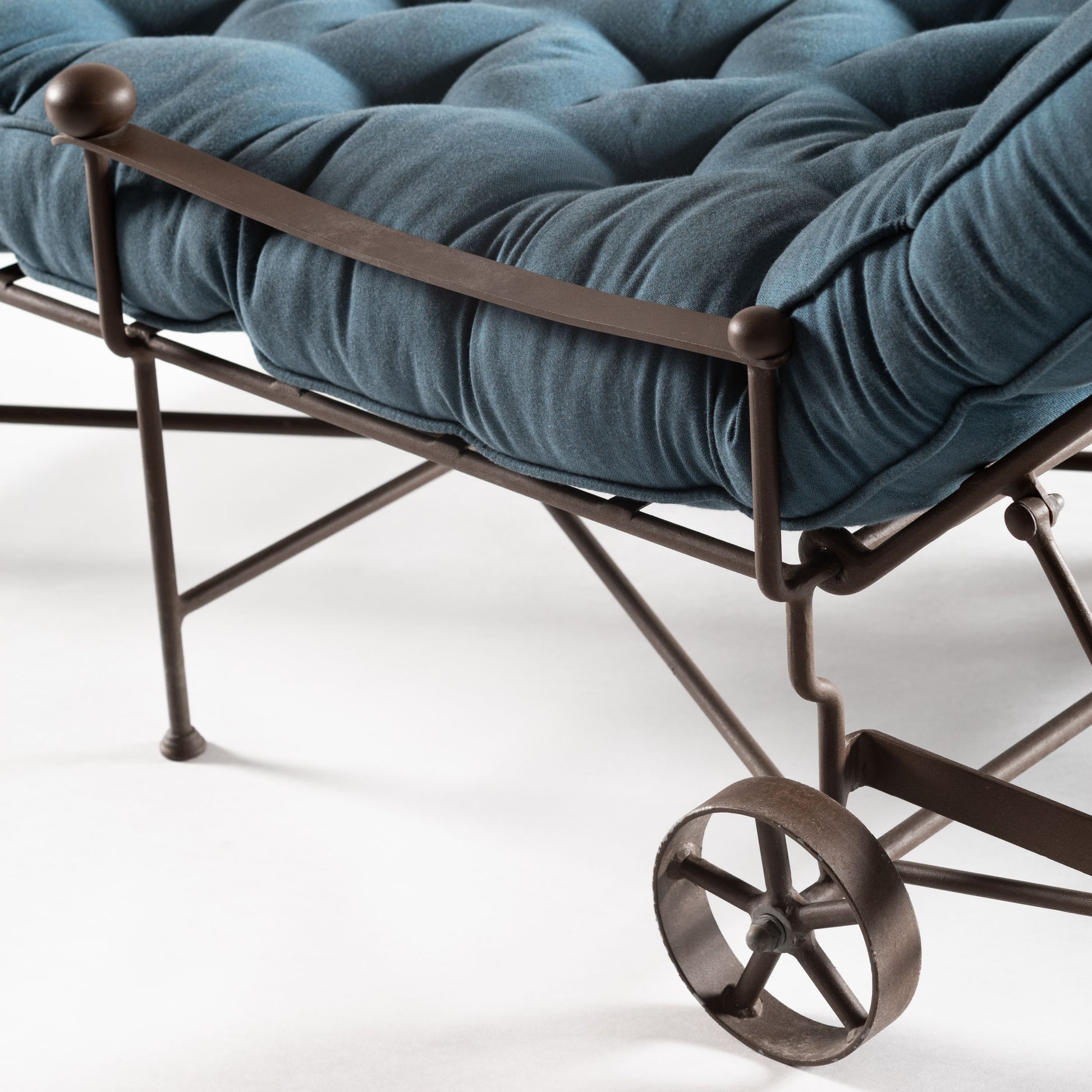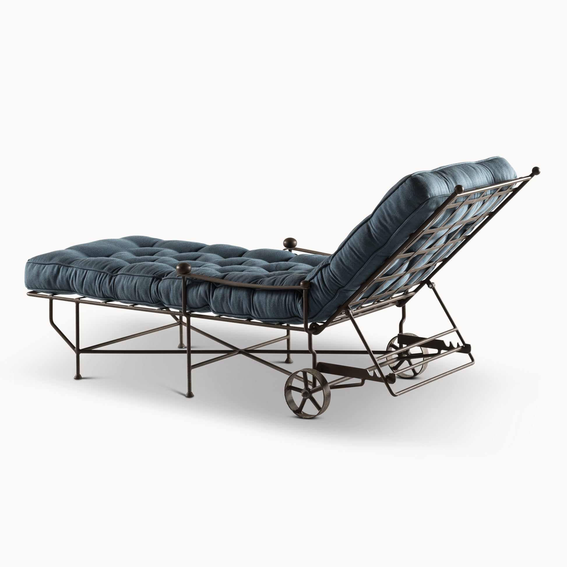 The Classic Garden Chaise Longue is a reclining outdoor lounger with a zinc-coated, powder-coated steel frame—originally finished in a rustic rust tone. Inspired by 18th-century designs, it features an adjustable backrest and generously padded, quilted cushions made for outdoor use. Fitted with discreet wheels, it is easy to move across terraces or gardens.