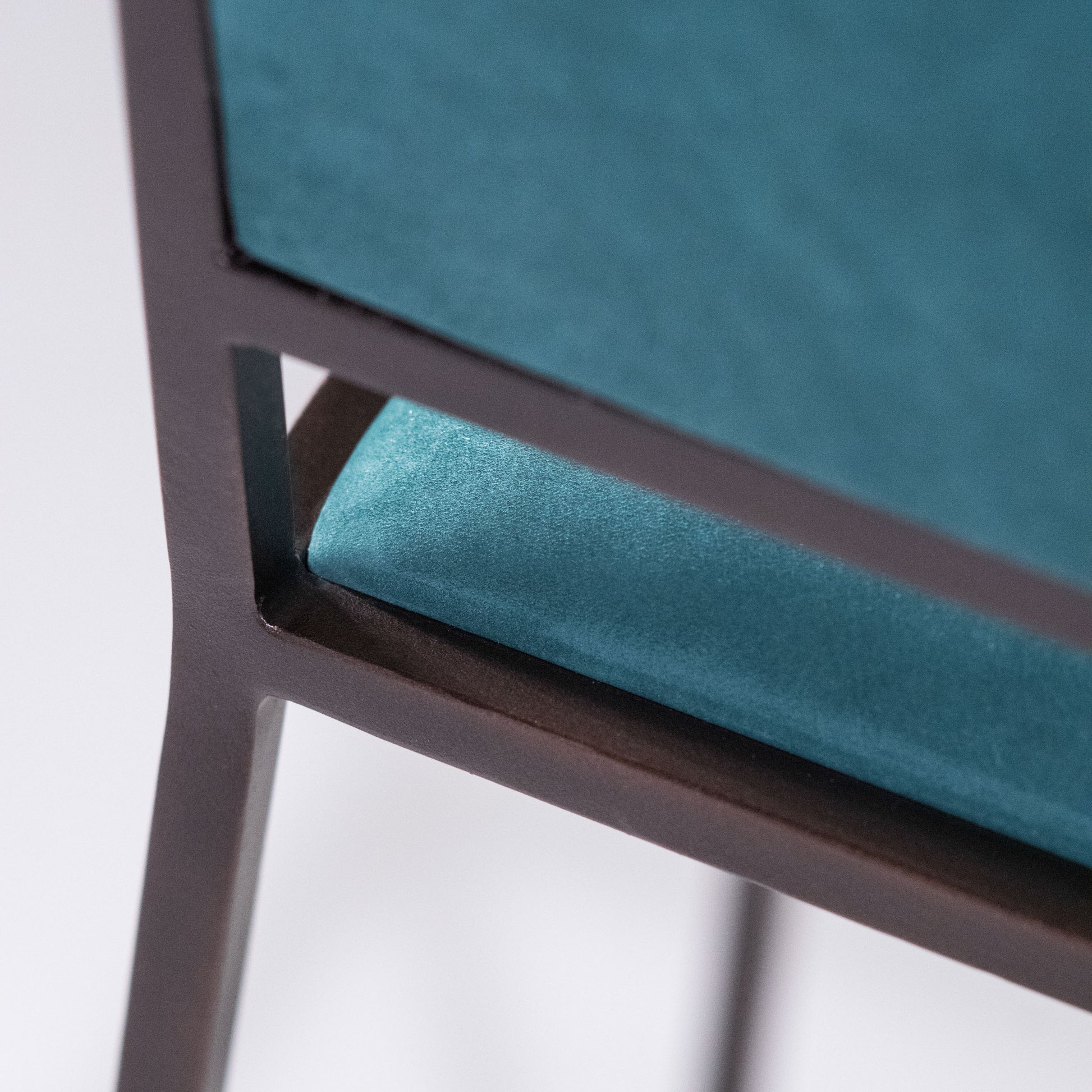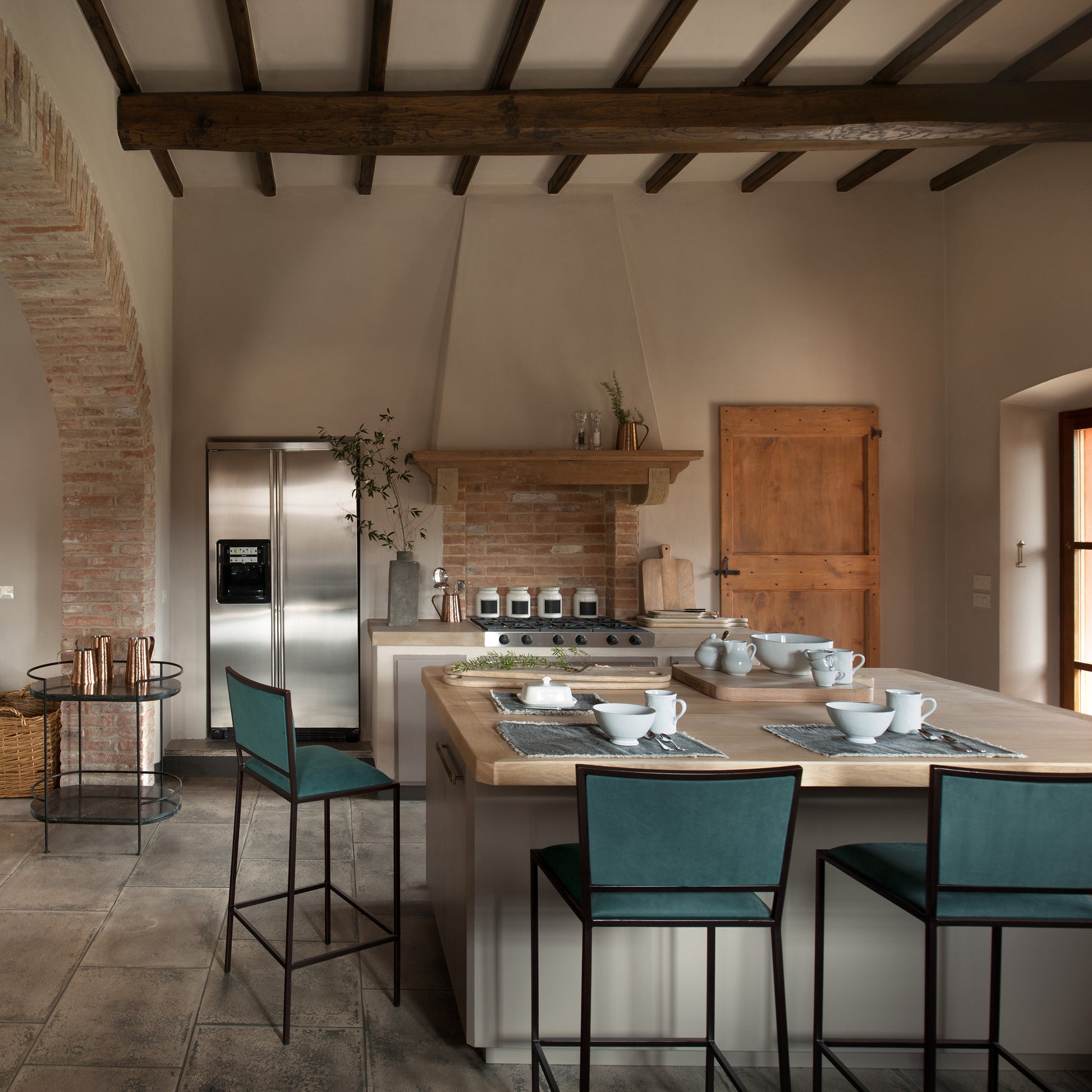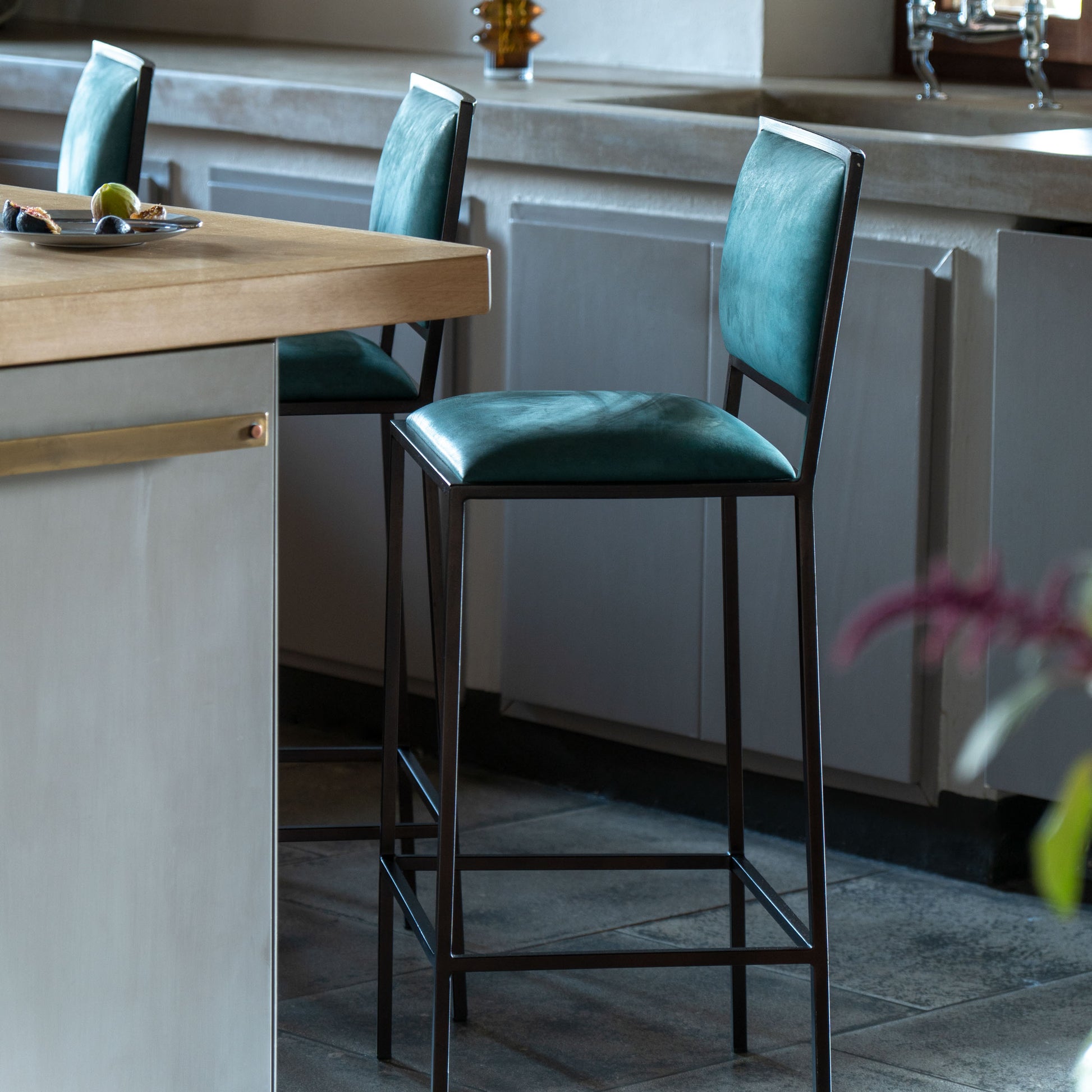 Essential and slender in form, this bar chair was designed for the kitchen islands of the Reschio Houses. The steel frame-either polished or powder-coated holds Italian leather cushions. Available with or without armrests.