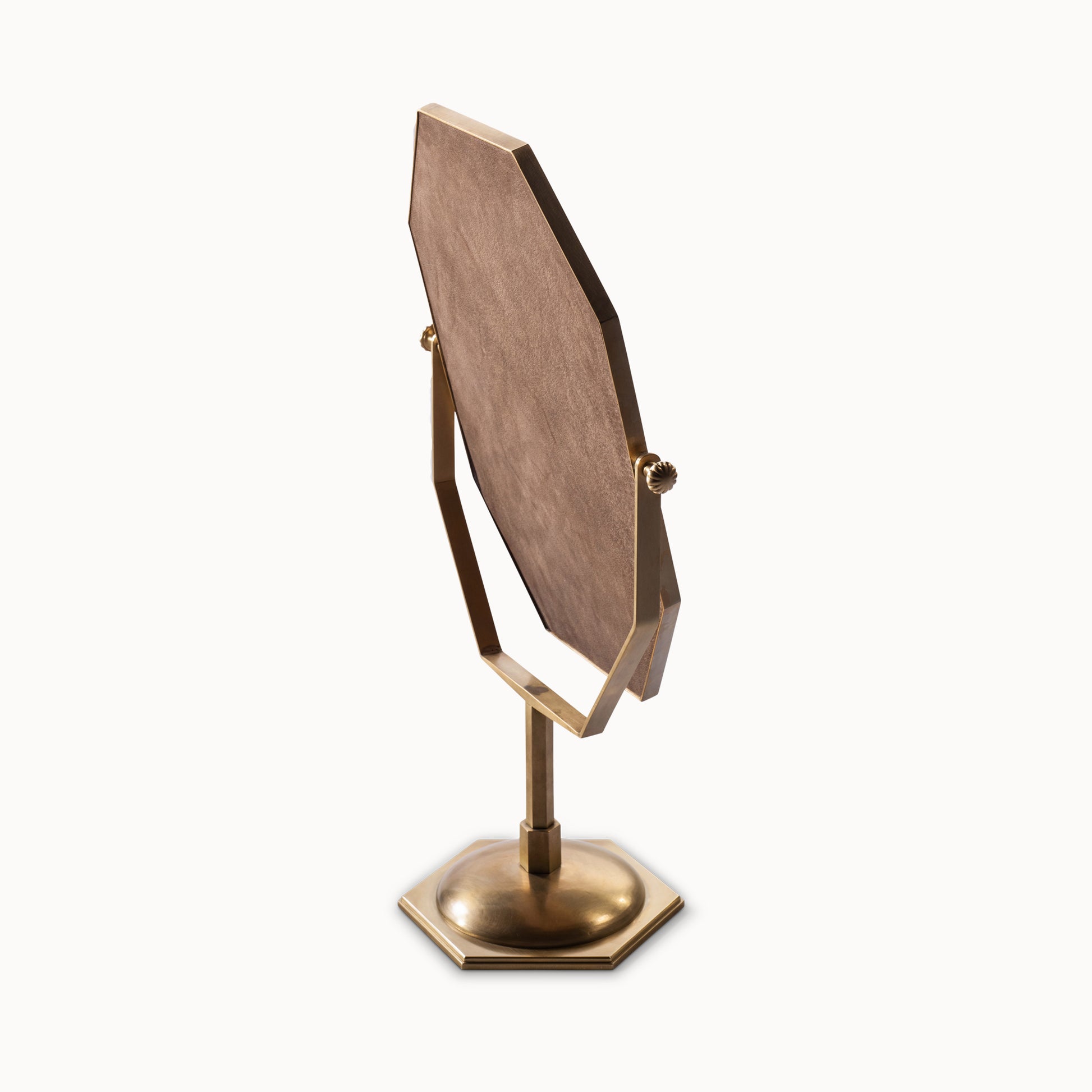 The first of its kind was made for an English jeweller who needed a mirror for clients to try on pieces in-store. Crafted in brass, this mirror’s swivelling frame is backed in leather, which can be customised in different shades.