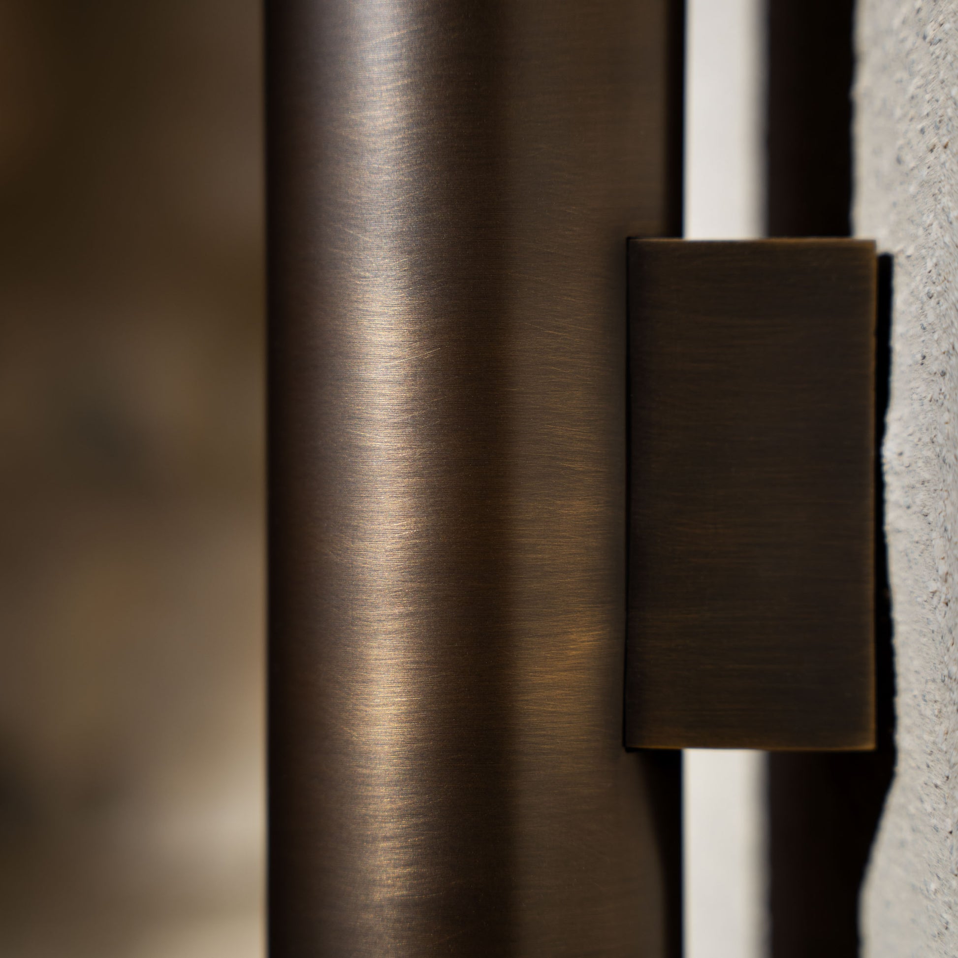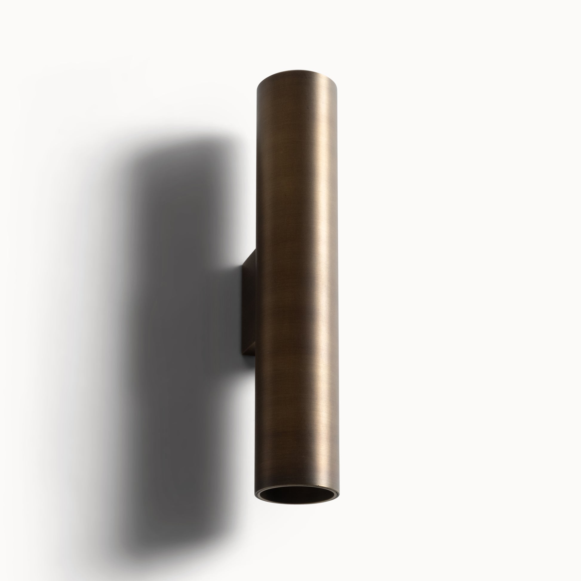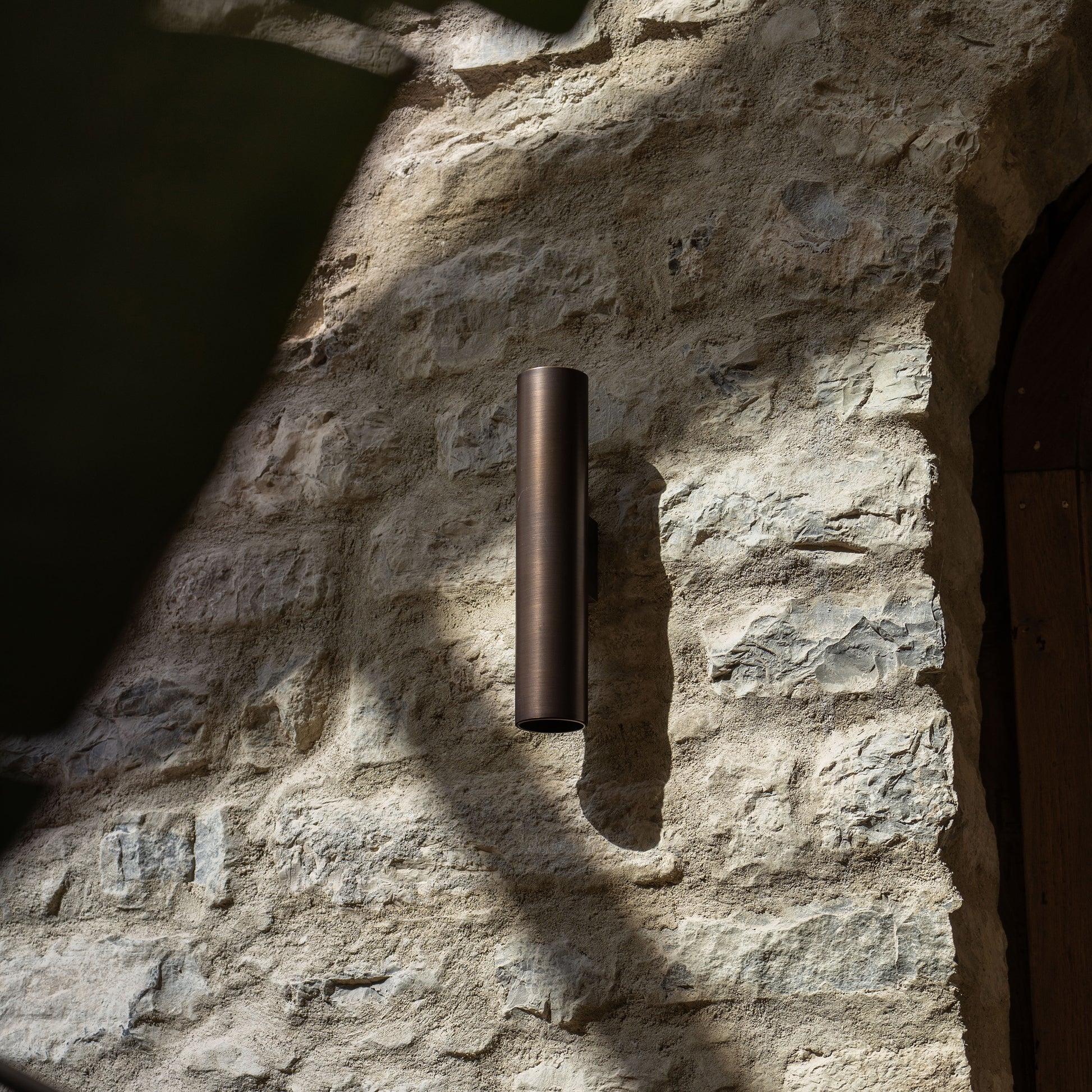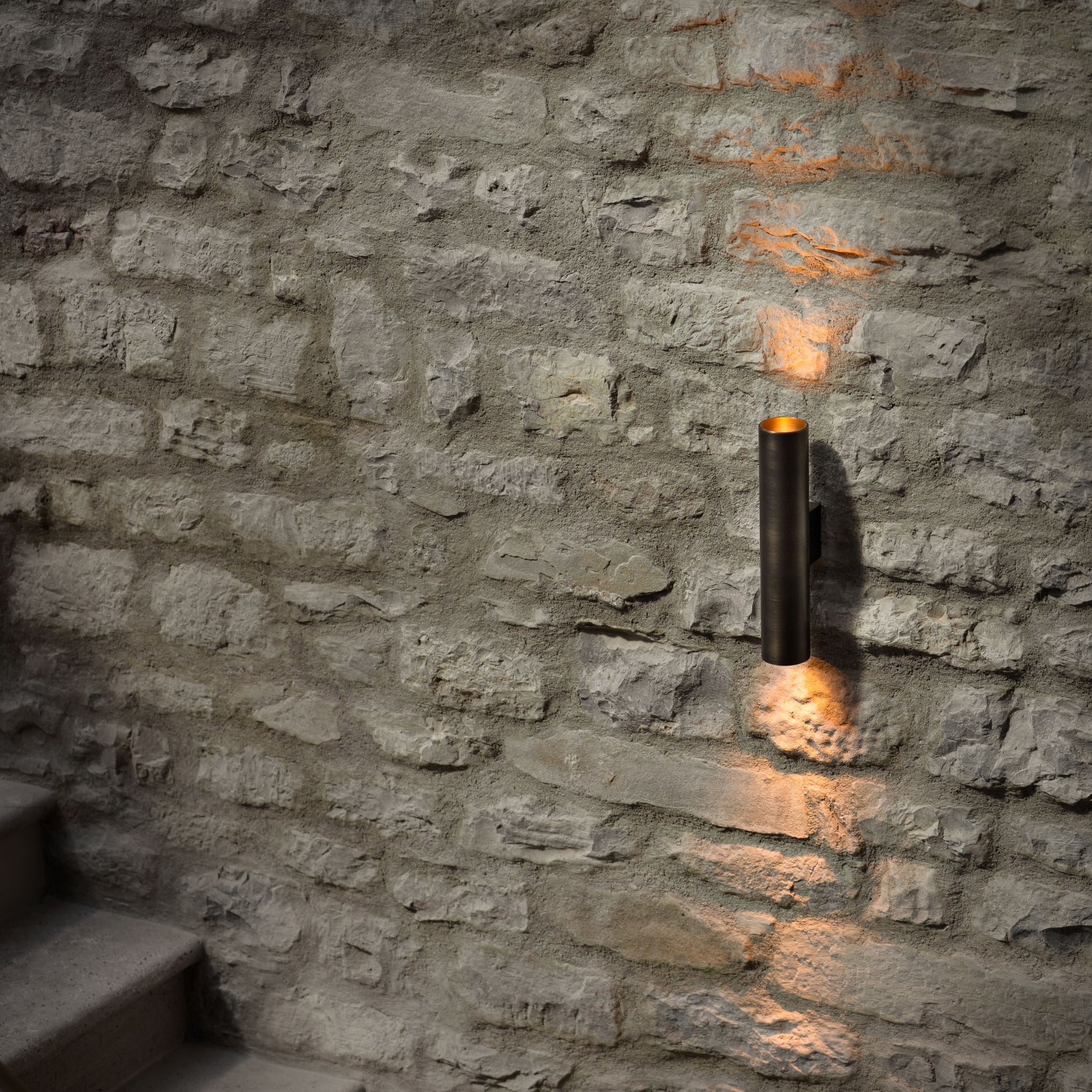 The Wall Lamp was designed to complement stone walls with elegance. A solid and tactile burnished brass tube holds a powerful LED light that shines both upwards and downwards.