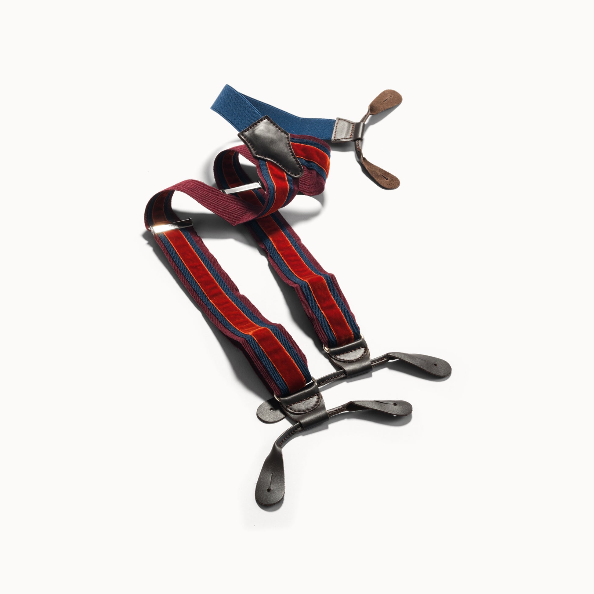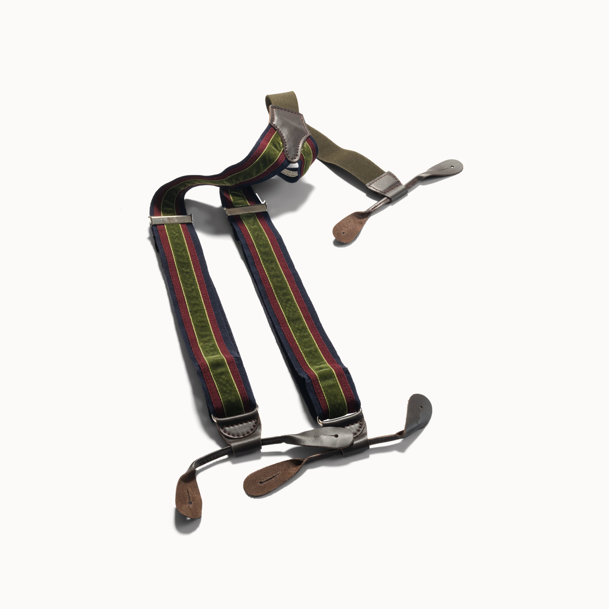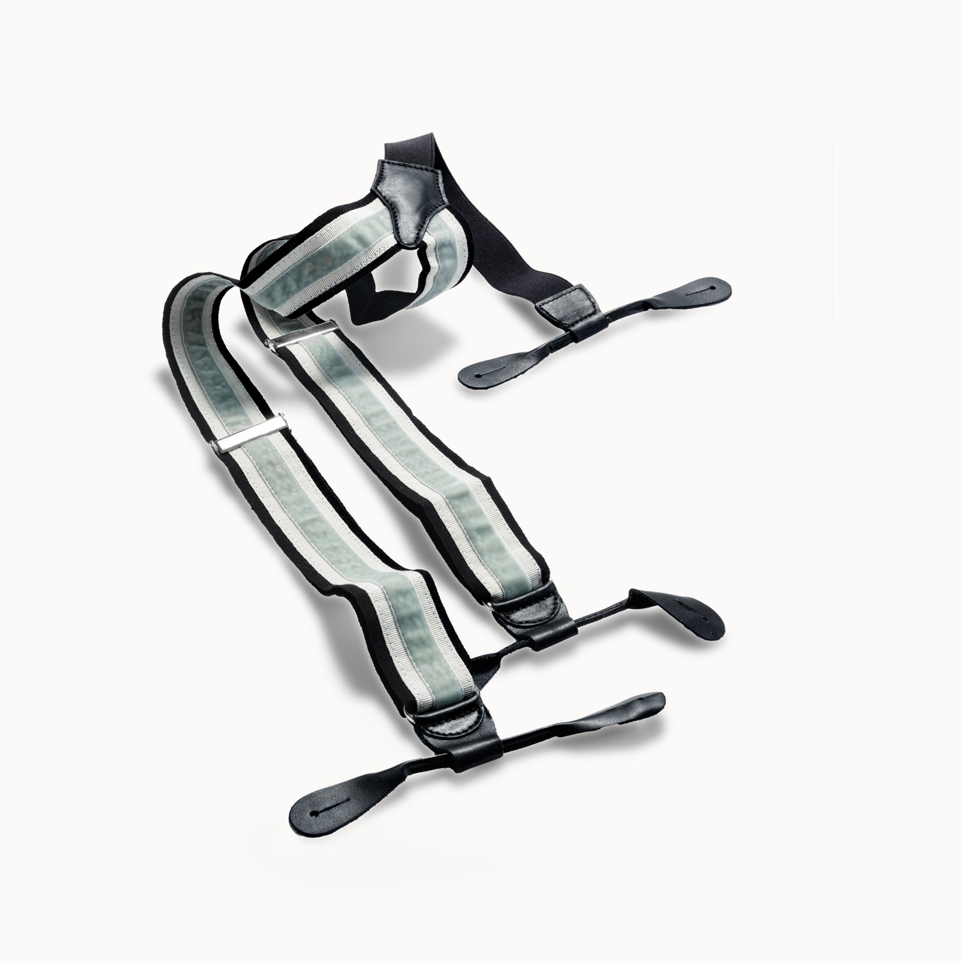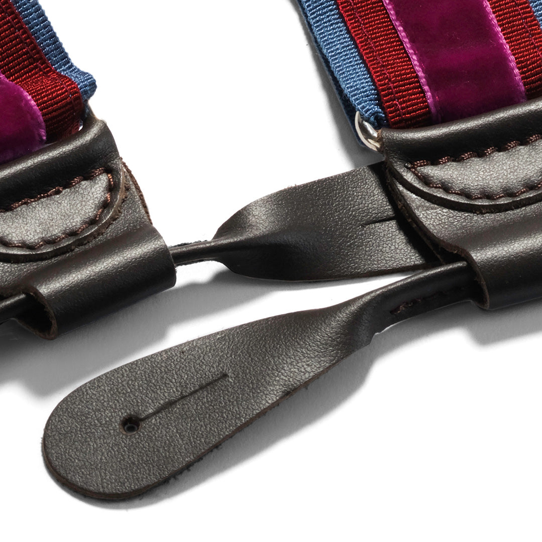 Crafted for those who appreciate refined details, these handmade braces blend elegance with comfort. Featuring grosgrain bands, smooth velvet and hand-stitched calf leather loops, every component is carefully selected. The one-size design adjusts easily with an elastic and sliding system. Meant to be worn with tailored trousers, in true classic style. Time and wear will only add to their charm.